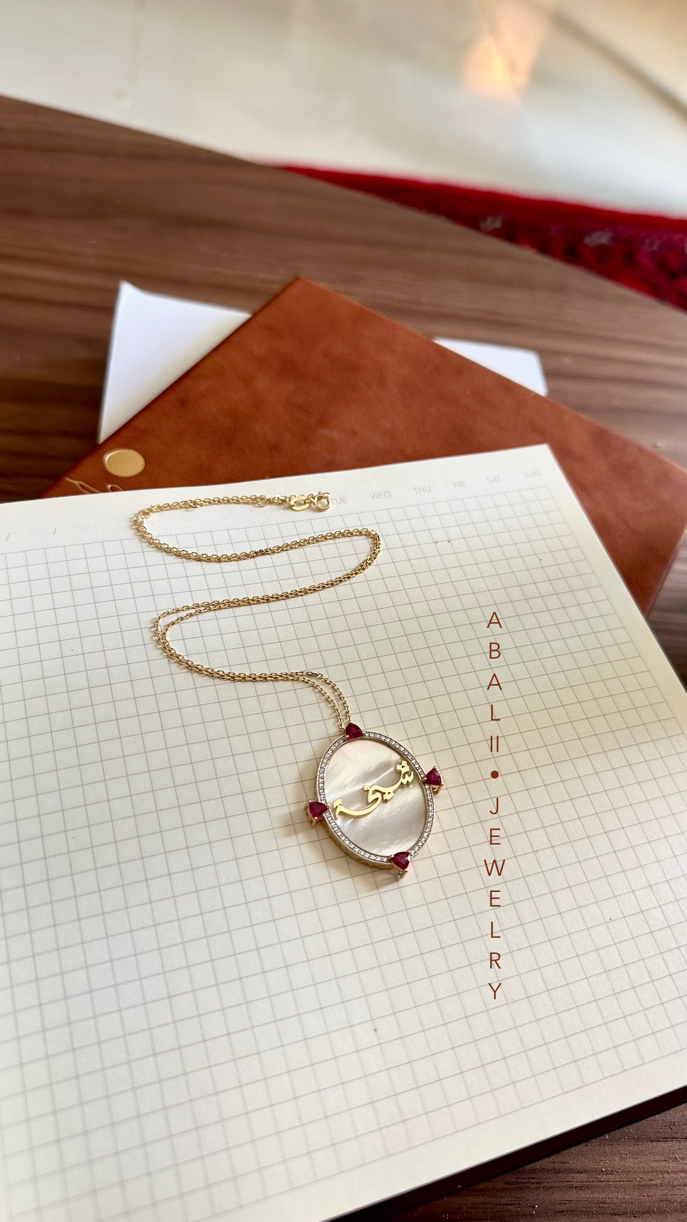 قطعة فاخرة من الذهب عيار ١٨ قيراط  يُصاغ اسمها خصيصًا على يد خطاط محترف، مرصّعة بالألماس وأحجار الياقوت الكريمة وصدف اللؤلؤ الطبيعي ببريقٍ ملكي.